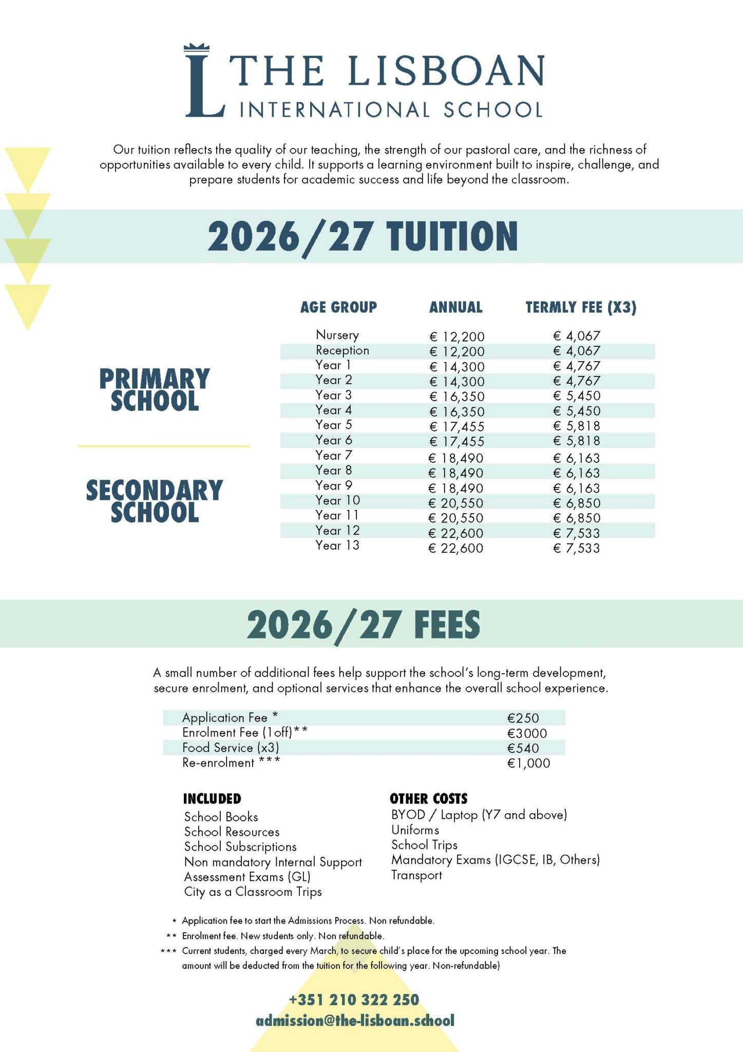 At The Lisboan, we believe in transparency when it comes to education costs. Below, you’ll find a breakdown of the application and enrolment fees as well as any additional fees/charges. Please note, all successful applicants are required to pay the enrolment fee for entry.